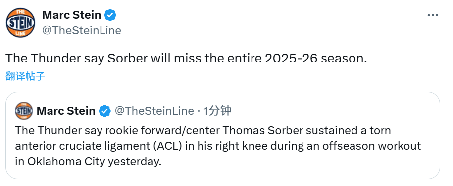 北京时间9月6日,雷霆官方宣布,今年的15号秀中锋托马斯-索伯在昨日俄克拉荷马城进行休赛期训练时,遭遇右膝前交叉韧带(ACL)撕裂的重伤,他已经确定缺席2025-26赛季。这是雷霆连续第二年遭遇首轮秀报销的状况,上赛季,他们的12号秀托皮奇因伤缺席了整个2024-25赛季,遭遇的伤病也是前交叉韧带撕裂。